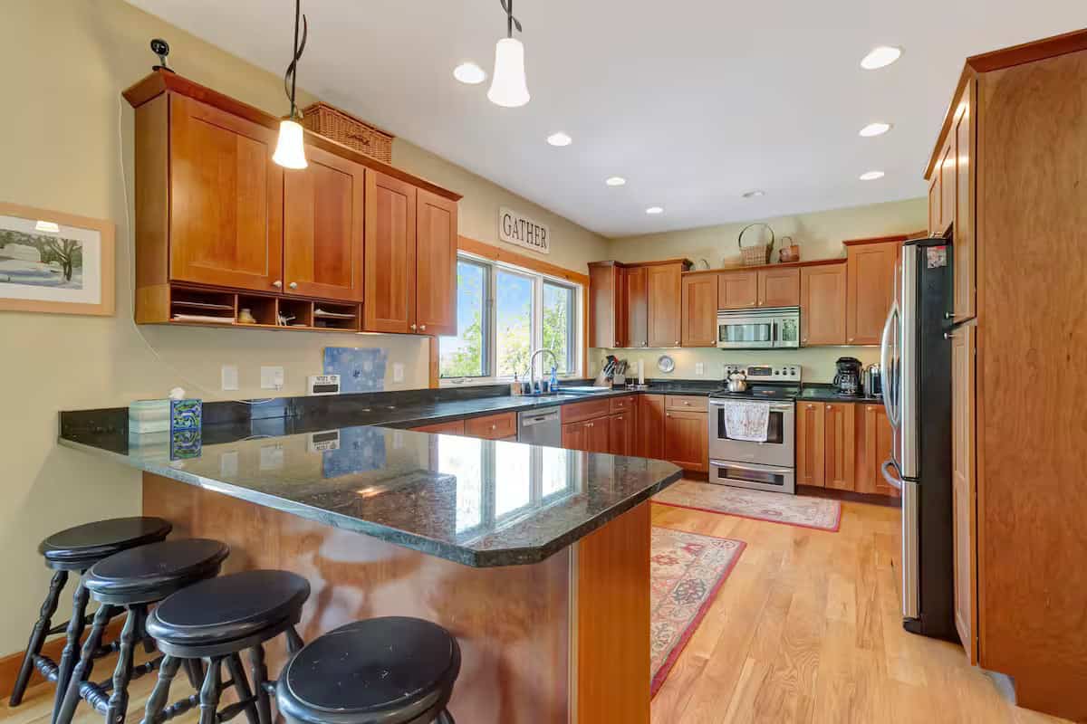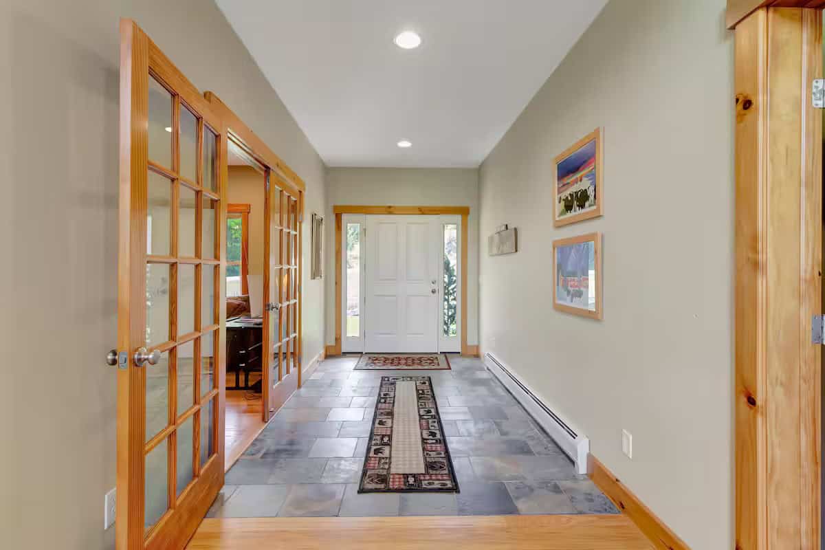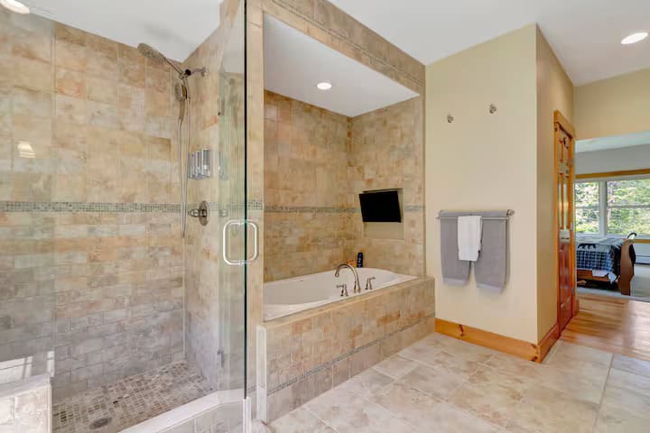With soaring cathedral ceilings, abundant natural light, a hot tub with views for days and multiple living spaces to spread, you'll be hard pressed to even leave this home to explore the beauty of Vermont! • 4 bedrooms + a lower level bonus open bedroom (no door) with 3 additional beds • 4.5 bathrooms • Sleeps 13 across 8 beds (2 King, 2 Queen, 1 full, 3 twin) • 2 living areas • Den/office • Enormous kitchen • Dining table seating for up to 14 • 2 Fireplaces! • 8+ person hot tub! The space A property that you'll never want to leave! Enter into the home through the garage and mud room and prepare to be blown away! Once through the entry hall you walk into the kitchen, dining, and living space that is just out of this world. With light and ceiling height for days the views will not disappoint; both inside and out! Head outside to the back deck and enjoy dinner and a drink while watching the wildlife come to life around you! Propane BBQ grill is on the deck for your use as well. Master bedroom with a King Bed on the main floor with a huge master bathroom that even has a TV in the TUB!!! On the main floor you also have the office/den and a half bathroom. Upstairs you'll have 3 additional bedrooms. Bedroom 1 with a queen bed and an ensuite bathroom. Bedroom 2 with a king bed and a shared bathroom with bedroom 3. Bedroom 3 boasts both a queen and a twin bed. On the lower level you have a massive 2nd living area, with a huge TV and fireplace, a foosball table, and the bonus sleeping space. In this bonus sleeping space you have a full size bed and 2 twin beds. On this lower level you'll also have the exit to the hot tub! Relax after a long day of exploration and let all your worries fade away. PETS: Due to allergies within the owners family, PLEASE disclose any/all dogs; we will try to be as accommodating as possible. We know this is tricky when it comes to true service animals but we would appreciate your honesty about this to protect the wellbeing of the family who is kind enough to share their wonderful home with you! WINTER SHUTTLE: There's a wonderful shuttle that runs on weekends and holidays. It runs a loop, continuously, from 8am - 4:30pm. It typically does pick ups from 8am - 12pm and drop offs from 1pm - 5pm. There's also a number you can call to schedule a pickup time.