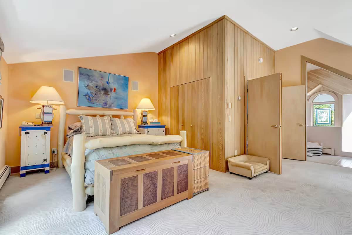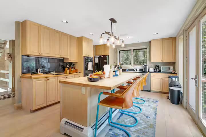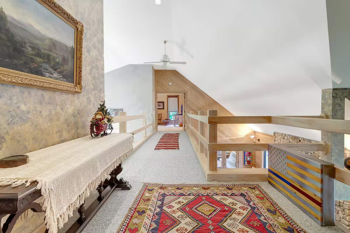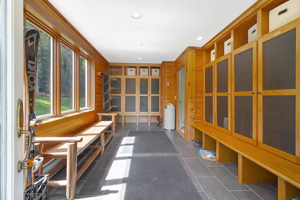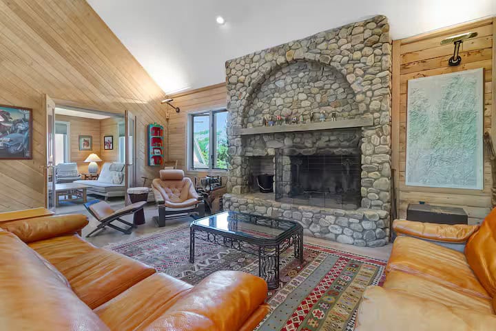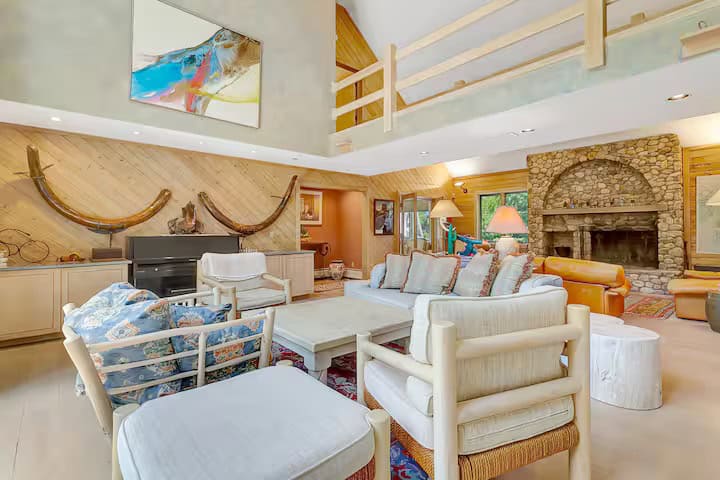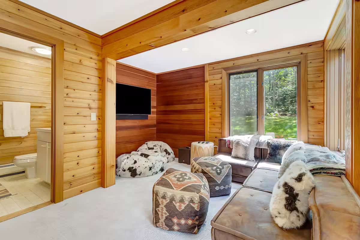 Bringing a taste of the Midwest to Southern VT, this 5 bedroom home is one for the 'Gram! From the gigantic tusks, to the massive high-backed dining room chairs, to the enormous hot tub, you will want to capture every moment here!! • 5 bedrooms • 5.5 bathrooms • Sleeps 14 across 9 beds (2 Kings, 1 set of King bunks, 1 queen, and 2 sets of twin bunks) • Hot tub • Shuttle • Ski on/off • Office • Foosball • 3 living areas • 5 min to Pikes Falls swimming hole • 18 min to Bromley • 25 min to Manch The space Come enjoy this wonderful family home situated at one of the highest points on Stratton Mountain (for housing). This ski on/off home is perfect for a long weekend or week long stay in Southern VT. Enter onto the lowest level where you'll have multiple rooms to explore!! You'll walk in to an enormous boot/ski room where you can unburden yourself from all of your outdoor apparel. Ditch the boots and shoes and skis and bikes and get ready to fully unwind! This bottom floor has 2 living areas. 1 with a large wrap around sofa, a foosball table and a large TV. The other with a gaming table, wrap around sofa and another television. There's even a 2nd fridge on this level for you so you can avoid the steps! Did someone say hot tub?? The owner provides flip flops for you to make your way out the back door to the HUGE hot tub that, easily, fits 9 people. On this 1st level you also have your 2 bunk rooms; 1 (the KING bunk beds) decorated for the little ladies in your family, and the other (2 twin bunks) for your boys. You'll also have 2 full bathrooms so no one has to argue about anyone taking too long! 🙂 Up the stairs to the main floor. This floor is a show stopper!! With decorations, artwork and furniture straight out of the Midwest and Costa Rica you'll be transported out of Southern, VT in an instant. On this level you have your full kitchen, dining room with amazing high backed wooden chairs, living room and a separate seating area just for you to enjoy the fire place! On this floor you'll also have an office with a large TV and TONS of games for people of all ages, and a bedroom with a queen bed and a full bathroom with a shower. No matter where you're relaxing there will be TONS of room for you to sprawl out and enjoy your favorite part of this house. This floor is also where you'll exit out onto the patio. (3 season - closed in winter). Deck is adorned with outdoor furniture, a large solo stove and a propane BBQ grill. So, kick back and enjoy your drink of choice after a long day hiking, biking, golf, or shopping in Manchester. 1 more floor! Climb the next set of steps and you'll get to your 2 en-suite masters. 2 huge rooms, both with king beds, and massive bathrooms. The bathrooms both have amazing soaking/jet tubs and separate showers. From this floor you can also look down to most of the 2nd floor and out of the amazing floor to ceiling windows that take up nearly the entire living room wall! Skiing!!! Just a quick walk to the trail and you're on your way! Just ski back down Lower Wanderer at the end of the day and pop onto the hiking/snowmobile path and you'll be home. Not a skier? Not to worry, there's still TONS to do on and off the mountain! Just 25 minutes from Manchester, you'll be able to kill all the time you need in the wall to wall shops or restaurants in town. WINTER SHUTTLE: There's a wonderful shuttle that runs on weekends and holidays. It runs a loop, continuously, from 8am - 4:30pm. It typically does pick ups from 8am - 12pm and drop offs from 1pm - 5pm.